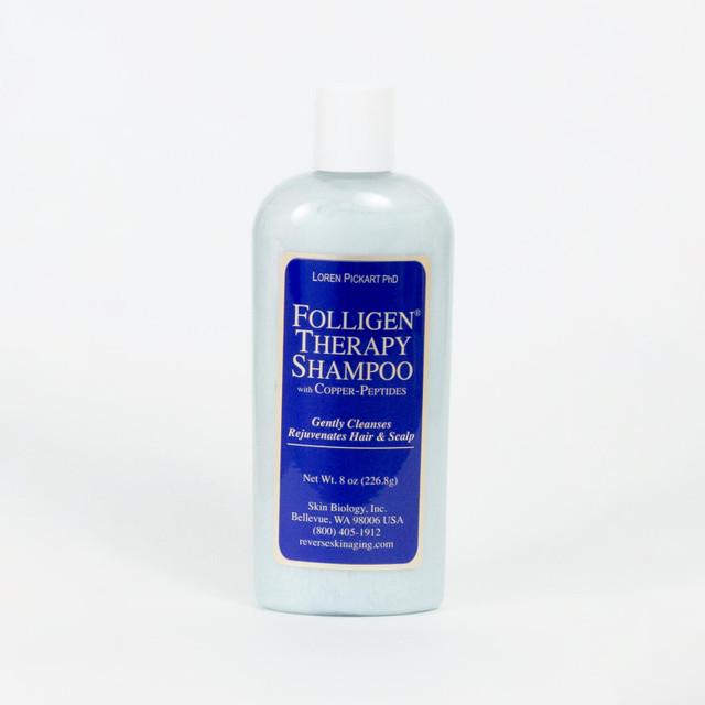 Шампунь фоллиген (folligen therapy shampoo), также как и спрей фоллиген, содержит высокую концентрацию пептидов меди совместно с ингредиентами, которые защищают волосы от воздействия окружающей среды. Шампунь разработан с низким Ph (5.8), что позволяет применять его на истончённых волосах без риска повредить стержни волос. Folligen шампунь очень мягкий и подходит для регулярного мытья головы.
