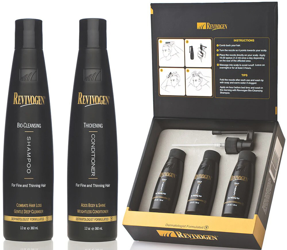 Revivogen успешно показал себя в лечении потери волос различной этиологии, он полностью безопасен и его применение не вызывает никакого зуда или раздражения со стороны кожи головы. Набор ревивоген состоит из трёх средств: самого лекарственного препарата (лосьона, выпускаемого в виде спрея), био-очищающего шампуня и кондиционера.