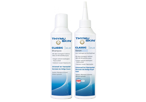 Тимускин "классик" (thymuskin classic) применяется, в большинстве случаев, при выпадении волос и облысении, в его состав входит оптимальная концентрация активных ингредиентов, которые восстанавливают волосяные фолликулы. Тимускин "классик" показал хорошие результаты при андрогенной алопеции у мужчин, продукт поспособствовал активации роста новых волос. В набор "классик" также входит безопасный для кожи шампунь, который следует применять вместе с сывороткой.