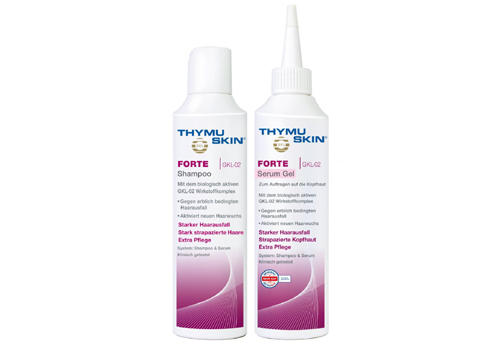 Тимускин "форте" (thymuskin forte) следует применять при выпадении волос после химиотерапии. Сыворотка "forte" активирует волосяные луковицы, которые были угнетены воздействием химиотерапии. Препарат необходимо применять только после полного прохождения курса химиотерапии, в противном случае есть риск повторения выпадения волос. Шампунь, входящий в состав набора "форте", деликатно воздействует на кожу головы. Ингредиенты данного шампуня подобраны так, чтобы его применение не вызывало неудобств при полном или частичном отсутствии волос.
