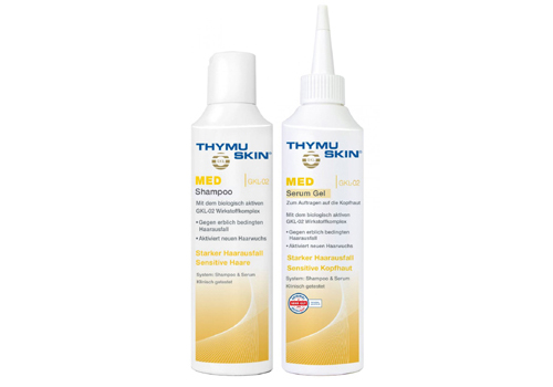 Тимускин "мед" (thymuskin med) используется при очаговом выпадении волос. Сыворотка "med" усилена высокой концентрацией пептида тимуса "ГКЛ-02", который способен остановить интенсивное выпадение волос. Тимускин "мед" также показал позитивные результаты при диффузном поредении волос, препарат активирует фолликулы и запускает рост новых волос. В набор "med" также входит и шампунь, который применяется совместно с препаратом.